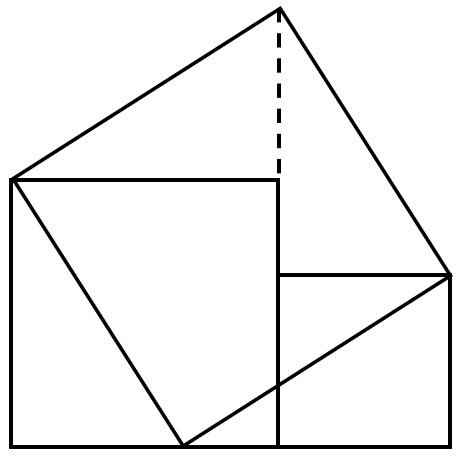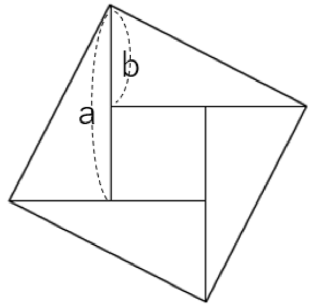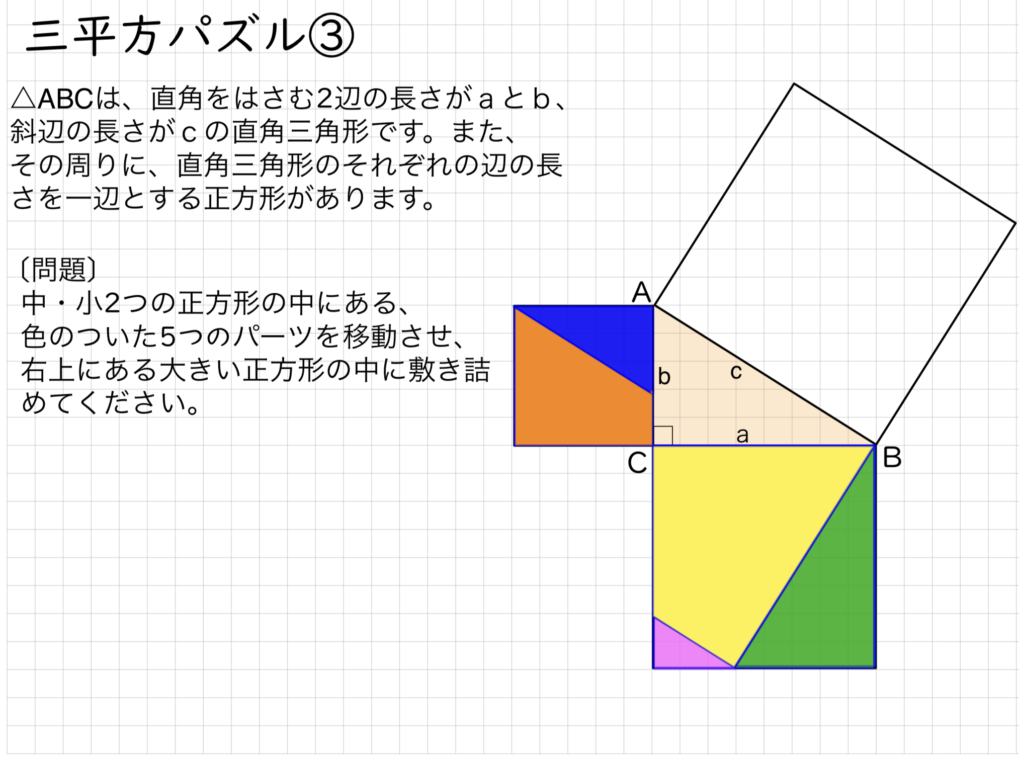 三平方の定理の導入として、昔から紙を切って並び替えるパズルが存在していたが、そのパズルをメタモジの図形機能で作成した。