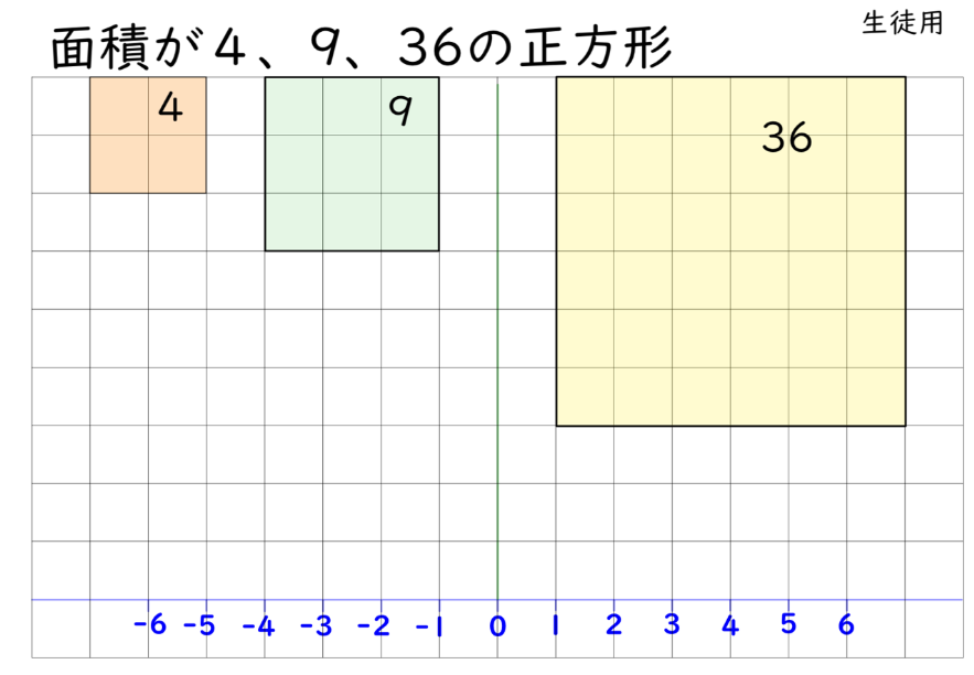 - 作った正方形の右端を、座標軸の原点に移動させて、1辺の長さを利用して負の数を確認する(-2,-3,-4)