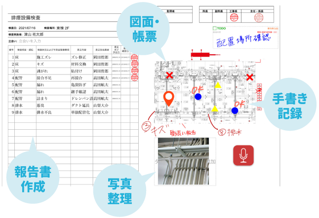 | 報告書作成 | 帰社して手作業 | 現場でデータ入力・自動作成 |