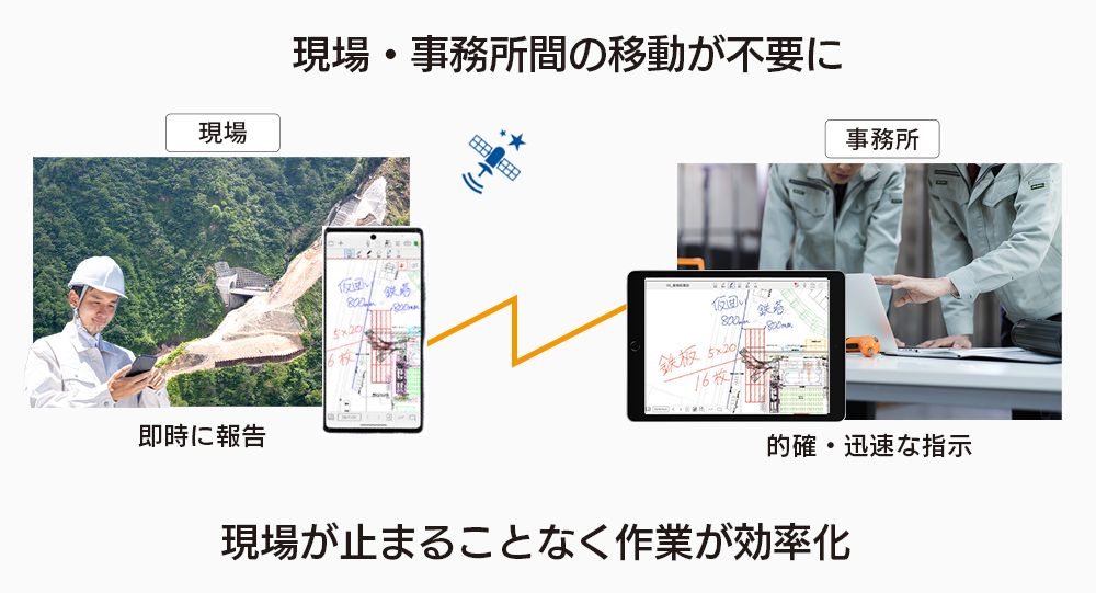 現場で発生した「異常」「トラブル」「安全衛生上の緊急対応」などを写真+手書きコメントでその場で報告。事務所から遠隔で迅速に対応できます。
