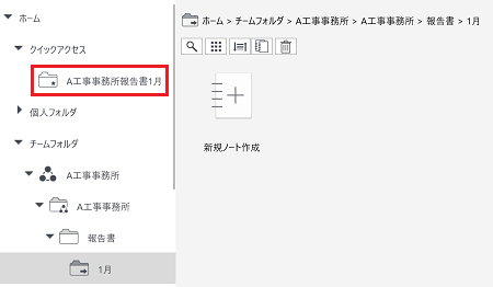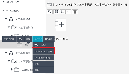 - ノート一覧画面のフォルダツリーで、フォルダを長押し、または右クリックして表示されるメニューの[操作]>[クイックアクセスに登録]をタップします。