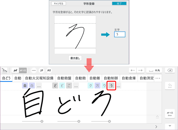 手書き文字をテキストに変換するときに、認識候補の選択肢に正しい文字が表示されない場合は、字形を登録しておくと認識されやすくなります。