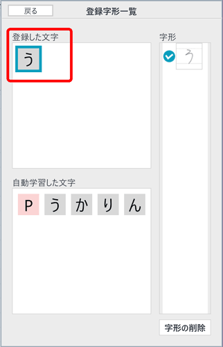 >[登録字形の一覧]をタップして、登録字形一覧画面の[登録した文字]で確認・削除します。