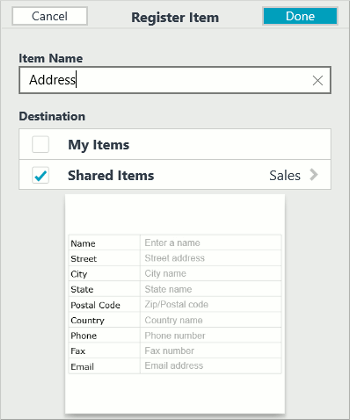 An Item is a customized object you can put on a page. Your frequently used objects such as drawings, text, photos, web pages and tables can be registered as items.
