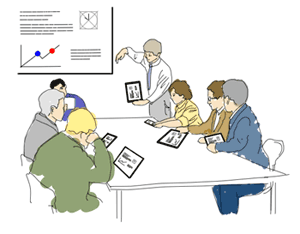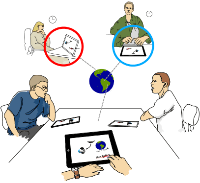 MetaMoJi Share can be used as a live interactive whiteboard for distributed group meetings across long distance. All members can see the same screen to facilitate the meeting.
