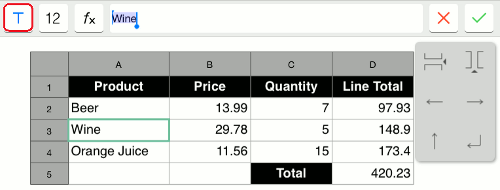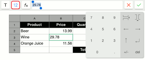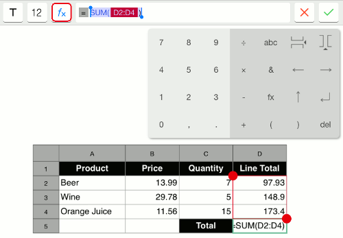 You can use numbers, text, calculation operations (+, -, x, รท), and functions (ABS, SUM, AVERAGE, COUNT, and CONCATENATE).