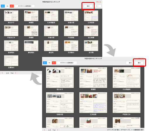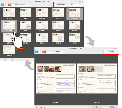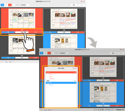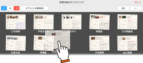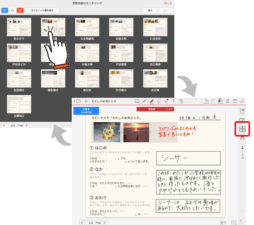 授業ノートの個別学習ページまたはグループ学習ページを表示しているとき、先生は生徒やグループの画面を並べたモニタリング画面を表示し、それぞれの編集内容を確認できます。