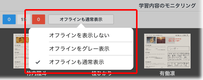 モニタリング画面左上の「オフラインも通常表示」をタップして、参加していない生徒の表示を変更できます。