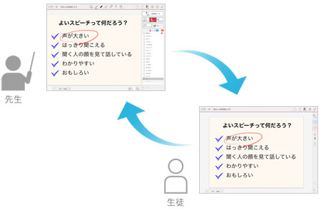 先生・生徒は、授業ノートをMetaMoJi ClassRoomで開くことで授業に参加します。授業中は、ノートの内容や書き込まれた内容を先生・生徒でリアルタイムに共有できます。