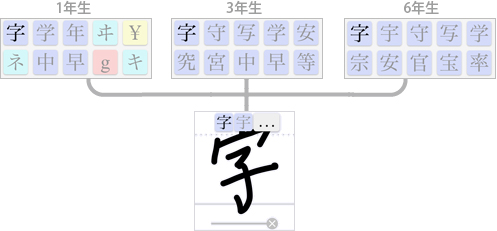 *指定された学年までに履修する漢字だけを認識する場合の例です。同じ字を書いても、学年によって表示される認識候補が違います。