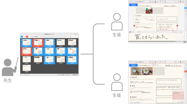講義モードでは、先生の画面が生徒のデバイスに表示されます。先生が授業ノートを拡大したり書き込んだりすると、それが生徒のデバイスにも反映されます。これにより、説明個所やポイントがよく伝わり、生徒の興味・関心を高めることができます。