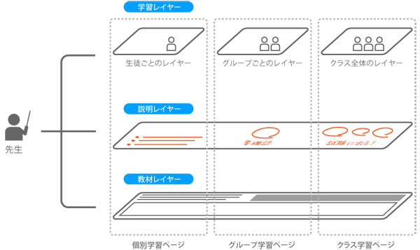 生徒には、通常、ほかの生徒・グループの学習レイヤーは表示されません。書き込めるのは、自分の学習レイヤー、自分のグループの学習レイヤー、クラスの学習レイヤーだけです。生徒がレイヤーを意識することはありません。