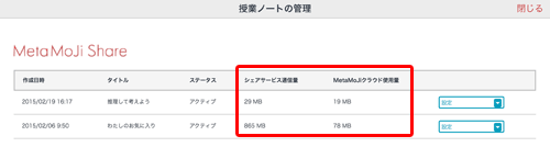 オーナーの先生は、自分が作成した授業ノートのシェアサービス通信量やサーバー使用量を一覧で確認できます。