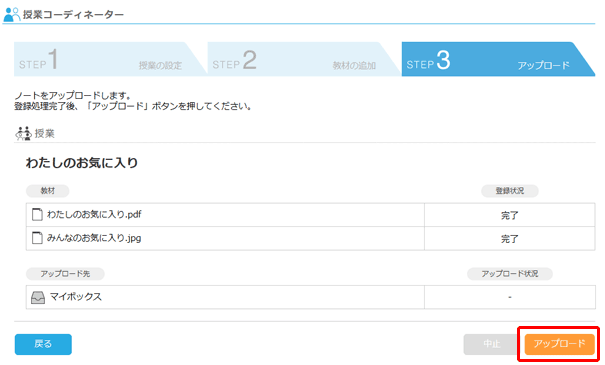- ファイル・保存先を確認して[アップロード]をクリックします。