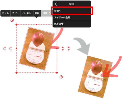重なった文字や写真を選んで、表示されるメニューの「操作」>「前面へ」・「背面へ」をタップすると、重なりの順序を変更できます。
