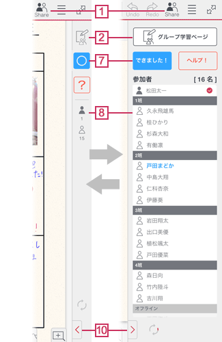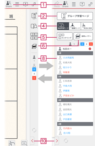 参加者の名前をタップすると、発表者への指名や学習内容の表示ができます。*シェアバーを閉じているときは、発表者がいる場合はそのアイコンと、先生・生徒の人数だけが表示されます。
